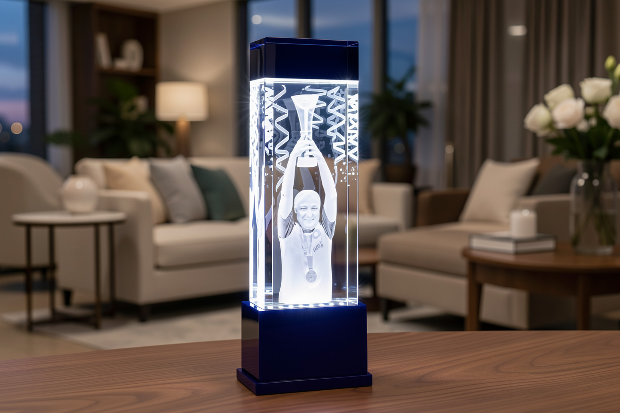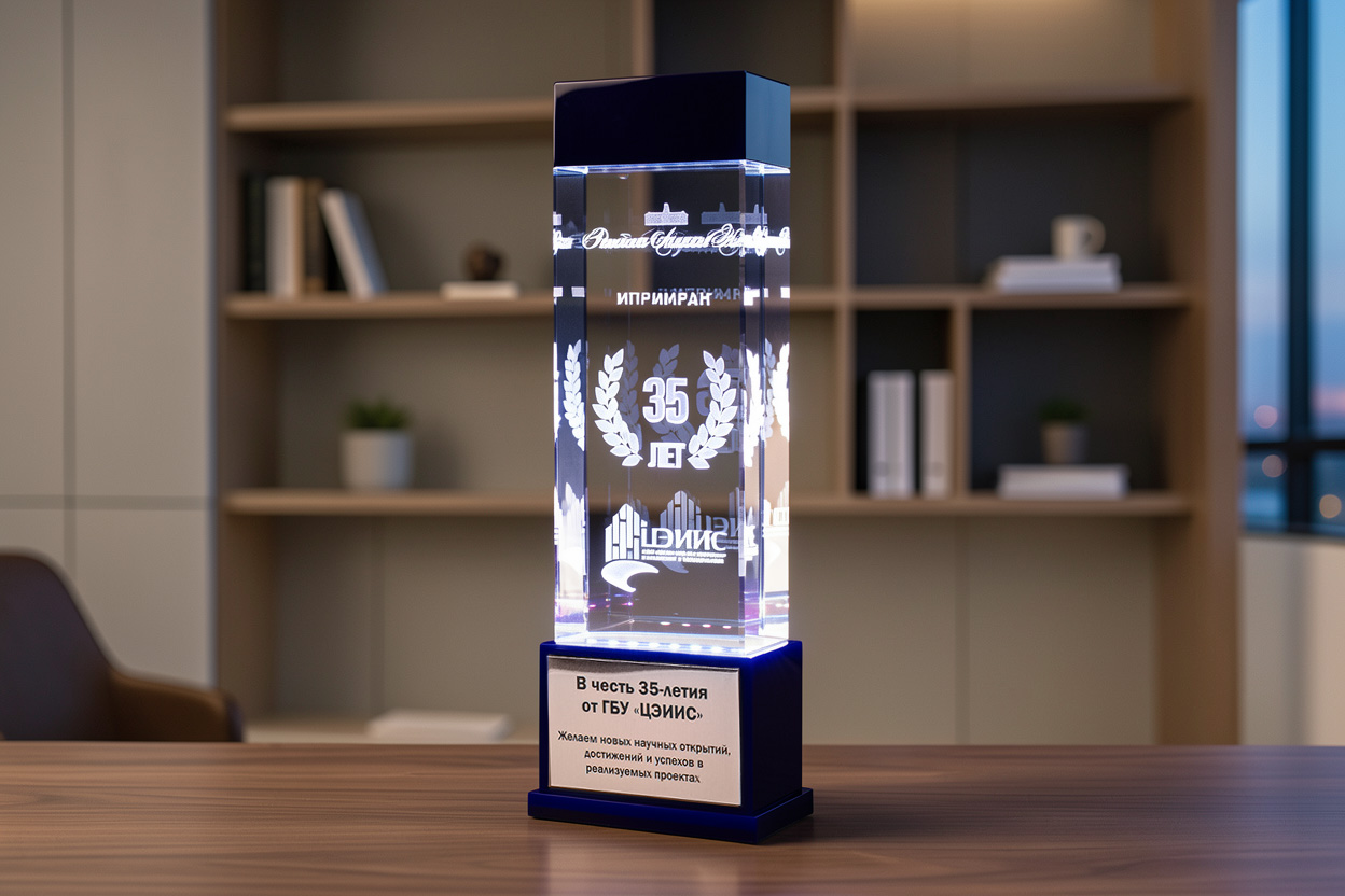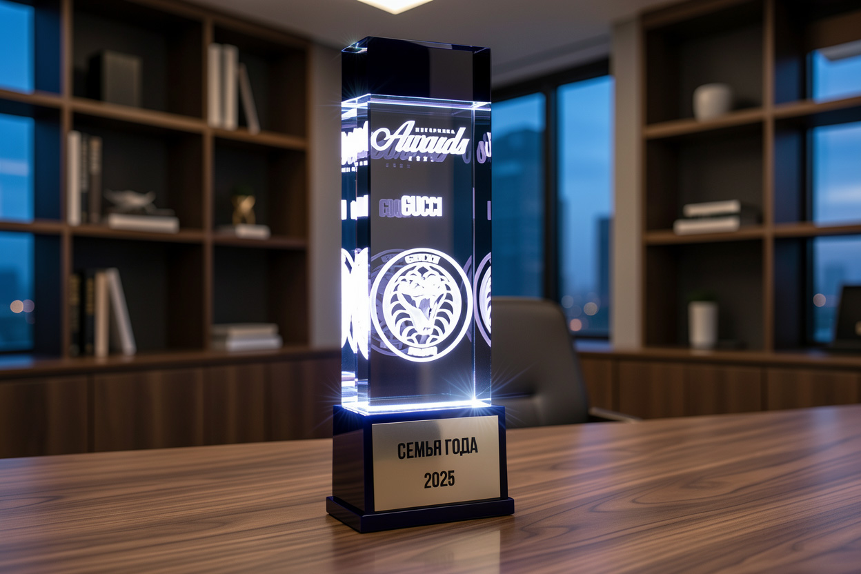 Изготовлен из абсолютно прозрачного оптического стекла. Высокий и массивный, этот светильник станет прекрасным подарком или наградой которую оценят по достоинству. Толщина стекла позволяет разместить в нем любые 3D изображения, отлично подойдет для гравировки высоких объектов и логотипов.
